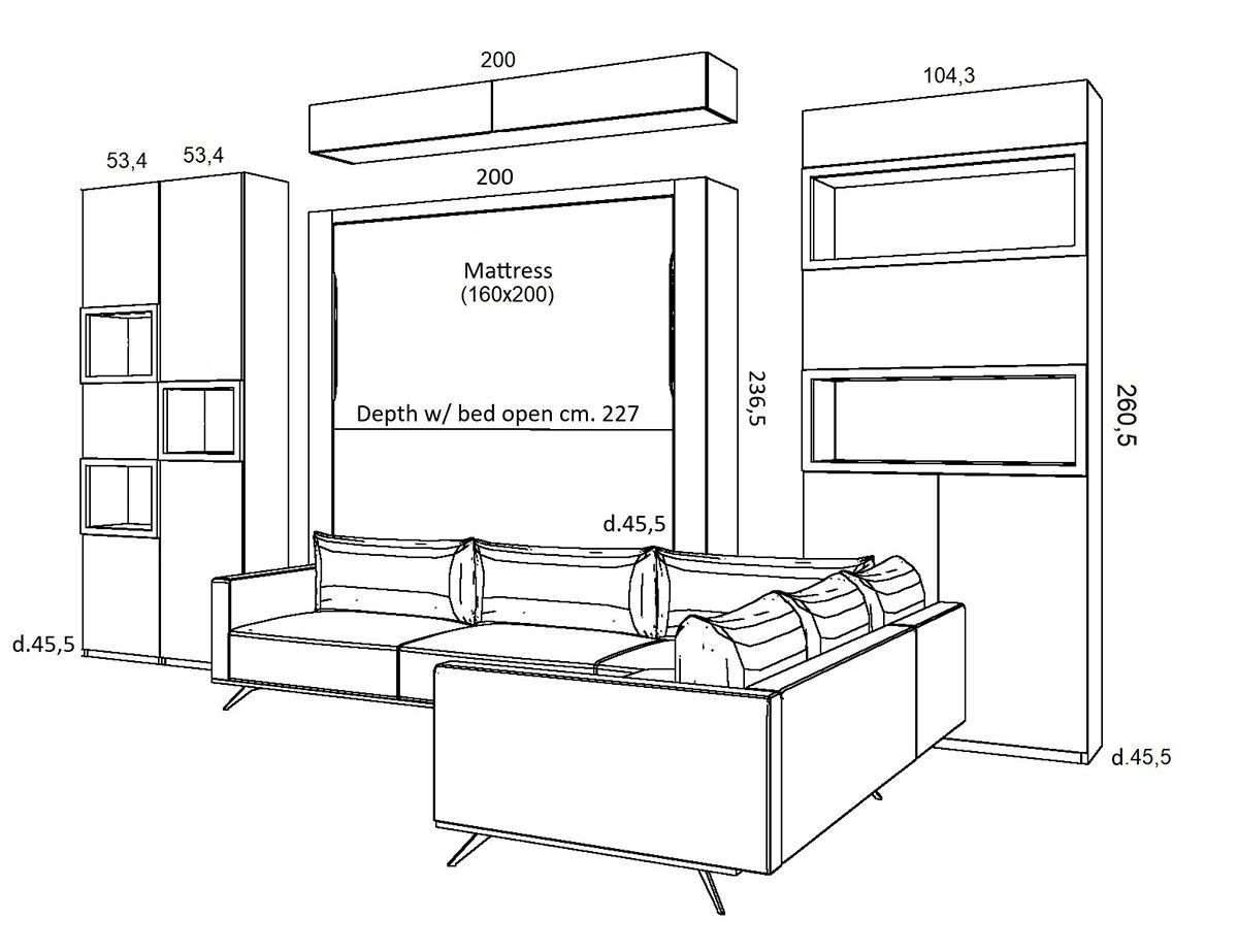 HOLIDAY is a modern vertical bed characterized by a refined style. The element of distinction are the 16 cm side front strips: this allows for internal shelves that serve as a nightstand and give harmony to the whole. It has a completely hidden integrated mechanism. Opening and closing of the bed are assisted by gas pistons and can be managed with the bed “ready-made” as spaces for blankets are also provided.