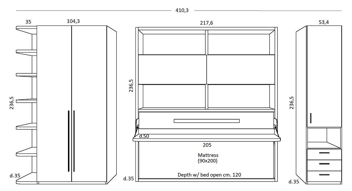 Available depths are 35 cm (footprint with the bed open from the wall 110 cm) and 45.5 cm (footprint with the bed open from the wall 120 cm). In the 45.5 solution it is also possible to have internal shelves.