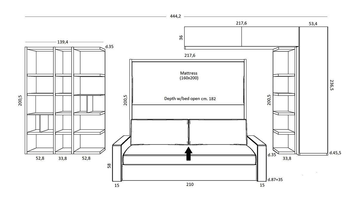 Available depths are 35 cm (creating a footprint of –> 132 cm, 162 cm or 182 cm when the bed is open from the wall, depending on whether the bed is a single, French or double bed, respectively) and 45.5 cm (creating a footprint of –> 142 cm, 172.5 cm or 192.5 cm when the bed is open from the wall, depending on whether the bed is a single, French or double bed, respectively). In the 45.5 cm solution, it is also possible to have internal shelves.