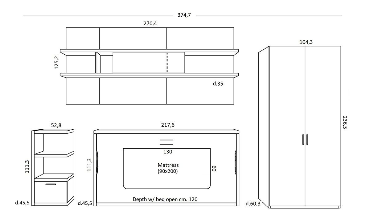 FLAP is a horizontal single bed characterized by a simple and linear design. Thanks to its lightweight and width-developed structure, it is a viable alternative to vertical solutions for anyone who needs to significantly reduce the footprint when opening. The mechanism is completely hidden by an aluminum-colored cover and is equipped with a safety lock. Opening and closing of the bed are both assisted by gas pistons and can be managed when the bed is at “ready-made” thanks to the calculation of the overall dimensions of the covers at the design stage. The bed base, made of wooden slats with elastic bands, favors the transpiration of the mattress and supports it to provide additional comfort.