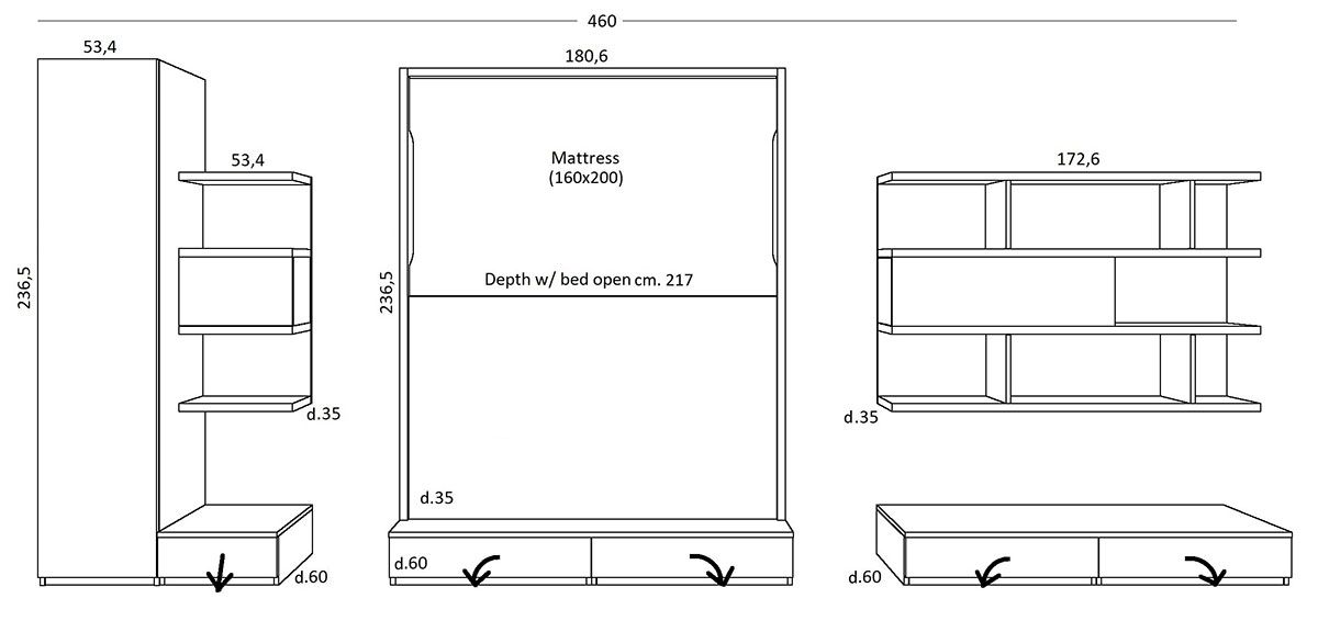 SBALZO is the perfect system for harmonizing a wall set up. It consists of CITY or SPACE bed and deeper base cabinets (60 cm). Thanks to this play of depth, the wall is lively and harmonious, where even the mechanism of the hide-a-bed blends in perfectly. The front of the bed is equipped with TV provision, and the cabinets serve as storage for wires.