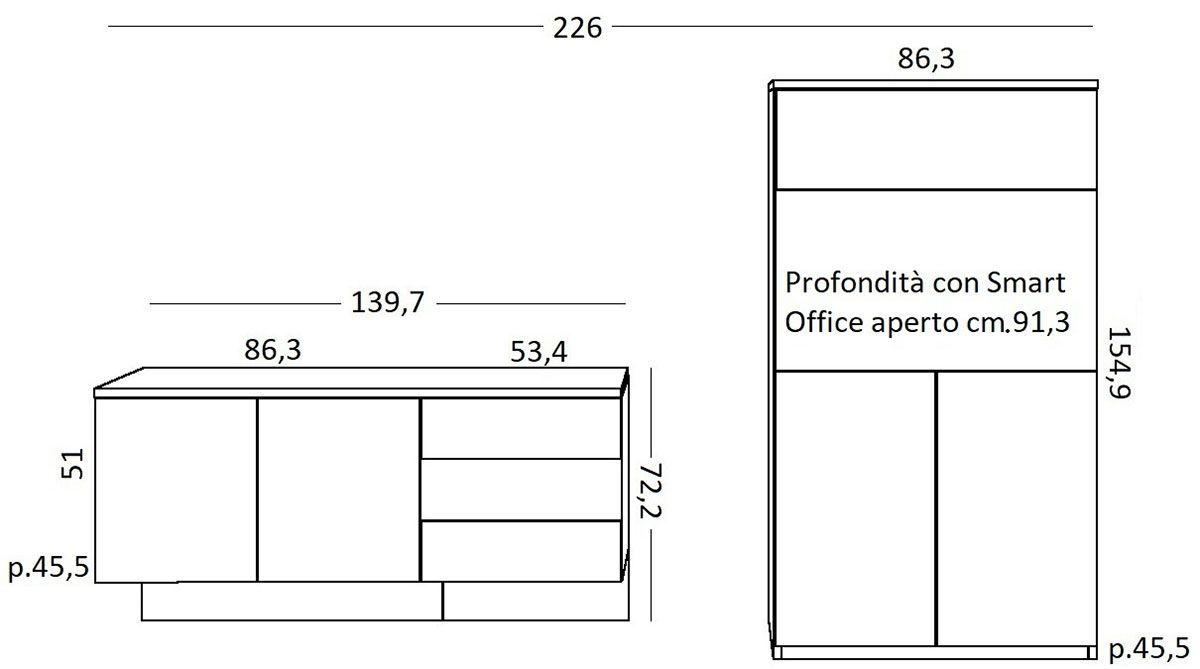 SMART OFFICE è un mobile contenitore diviso in due settori, uno chiuso con ante battenti e uno con anta a ribalta. L’anta a ribalta diventa un robusto piano scrittoio autoportante che chiude un vano dotato di mensola interna, foro passacavi e illuminazione LED.