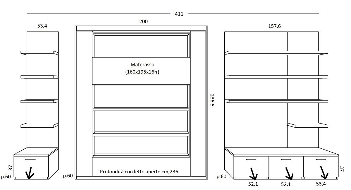 METROPOLIS è il trasformabile per eccellenza. Unico nel suo genere, nasconde il letto con un vero e proprio mobile contenitore dotato di mensole e/o vano porta TV che non lascia assolutamente intuire la funzione a cui è destinato. Il sistema di rotazione è completamente in sospensione senza l’ausilio di ruote che scorrono sul pavimento, garantendo così il perfetto funzionamento anche in presenza di tappeti o parquet delicati. Apertura e chiusura del letto sono entrambe assistite da pistoni a gas e possono essere gestite a “letto pronto” grazie al calcolo degli ingombri delle coperte in fase di progettazione.