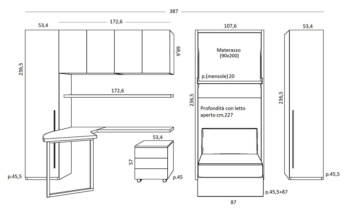 Il meccanismo è completamente nascosto all’interno della struttura ed è dotato di una chiusura di sicurezza. Apertura e chiusura del letto sono entrambe assistite da pistoni a gas e possono essere gestite a “letto pronto” grazie al calcolo degli ingombri delle coperte in fase di progettazione.