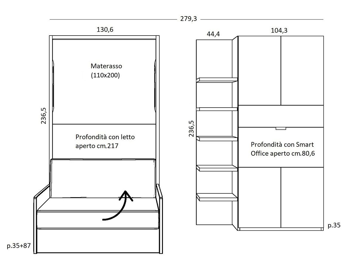 Il meccanismo è completamente nascosto all’interno della struttura ed è dotato di una chiusura di sicurezza. Apertura e chiusura del letto sono entrambe assistite da pistoni a gas e possono essere gestite a “letto pronto” grazie al calcolo degli ingombri delle coperte in fase di progettazione.